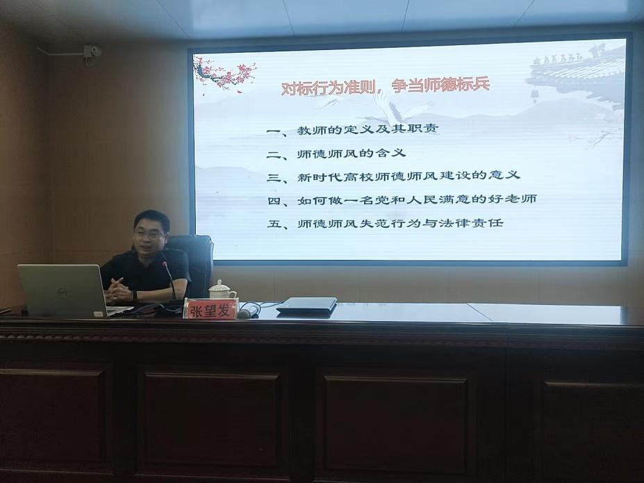 报告题为“对标行为准则,争当师德标兵”,张望发从教师的定义及其职责、师德师风的含义、新时代高校师德师风建设的意义、如何做一名党和人民满意的好教师、师德师风失范行为与法律责任五个方面全面诠释了高校教师师德标兵应该具有的素养及其实现路径。