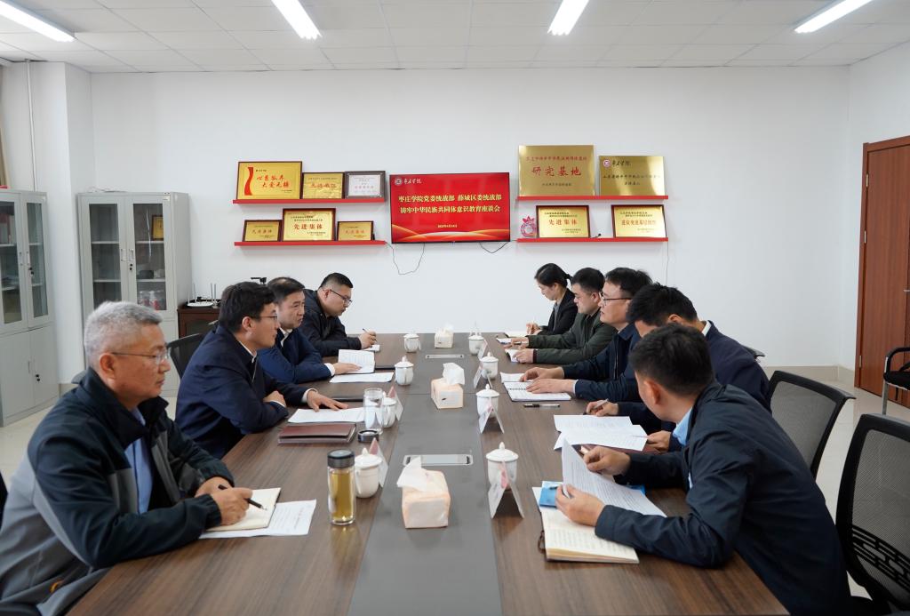 林勇代表学校对樊晓阳一行表示热烈的欢迎,也感谢薛城区对学校各项工作的大力支持。他详细介绍了学校在加强铸牢中华民族共同体意识教育及山东省铸牢中华民族共同体意识研究基地相关工作开展情况。他指出,铸牢中华民族共同体意识是新时代党的民族工作的主线,也是民族地区各项工作的主线。学校在两校区同步开设《中华民族共同体概论课程》,将铸牢中华民族共同体意识融入教育教学全过程,积极构建嵌入式育人环境,在课程建设、实践活动、阵地打造等方面创新举措,通过场景式、沉浸式、交互式学习方式提升铸牢中华民族共同体意识教育质效,引导全校师生争当铸牢中华民族共同体意识的践行者、倡导者、传播者。他强调,下一步学校将发挥优势,不断深化对各领域民族问题的研究,推动形成符合新时代民族工作要求的铸牢中华民族共同体意识研究体系,联合薛城区委统战部共同推动铸牢中华民族共同体意识教育工作走深走实,为促进民族团结、构建和谐社会贡献枣院力量。
