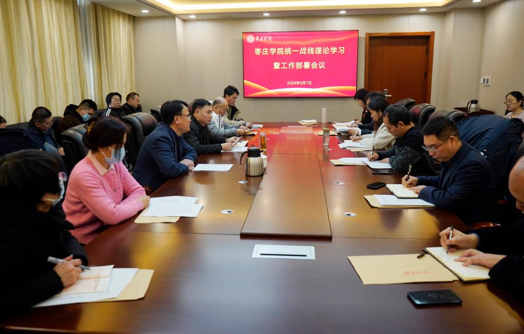 会议传达学习了《习近平总书记在第二十届中央政治局举行第九次集体学习时的重要讲话精神》《全国统战部长会议精神》《全省统战部长会议精神》《全市统战部长会议精神》等内容,通报了《枣庄学院2023年统战工作开展情况及2024年统战工作要点》。大家纷纷表示,要认真贯彻落实习近平总书记重要讲话和各级统战部长会议精神,引领广大统战成员深刻领悟“两个确立”的决定性意义,始终在思想上政治上行动上同以习近平同志为核心的中共中央保持高度一致。要坚持和加强党的全面领导,持续完善大统战工作格局,为推进学校高质量发展更好凝心聚力。