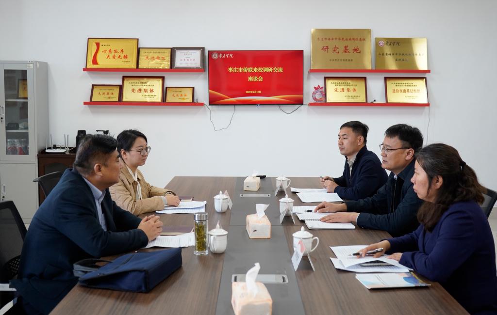 4月15日,枣庄市侨联党组成员、副主席满清义带队来校调研交流高校侨联建设工作。校党委委员、统战部部长林勇,校外国语学院院长、欧美同学会会长韩建侠及统战部办公室主任郑欢参加座谈。